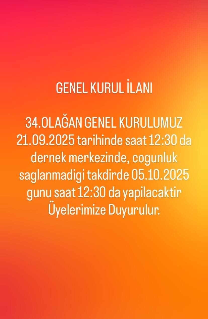 34.OLAĞAN GENEL KURULUMUZ 21.09.2025 tarihinde saat 12:30 da dernek merkezinde , çoğunluk sağlanmadığı taktirde 05.10.2025 günü saat 12:30 yapılacaktır. Üyelerimizde duyurulur.